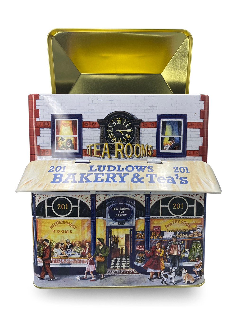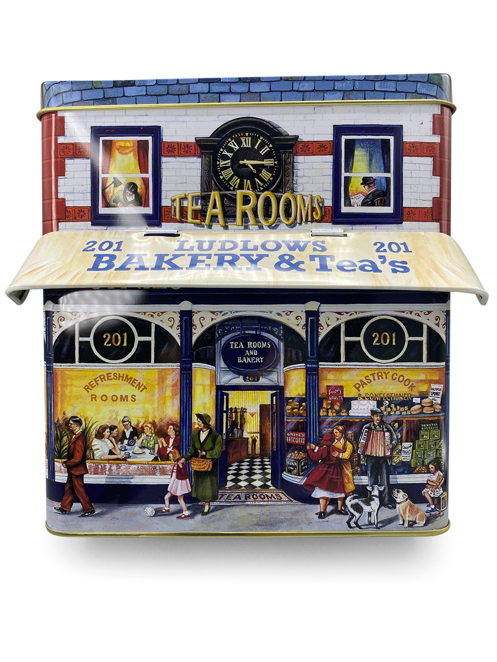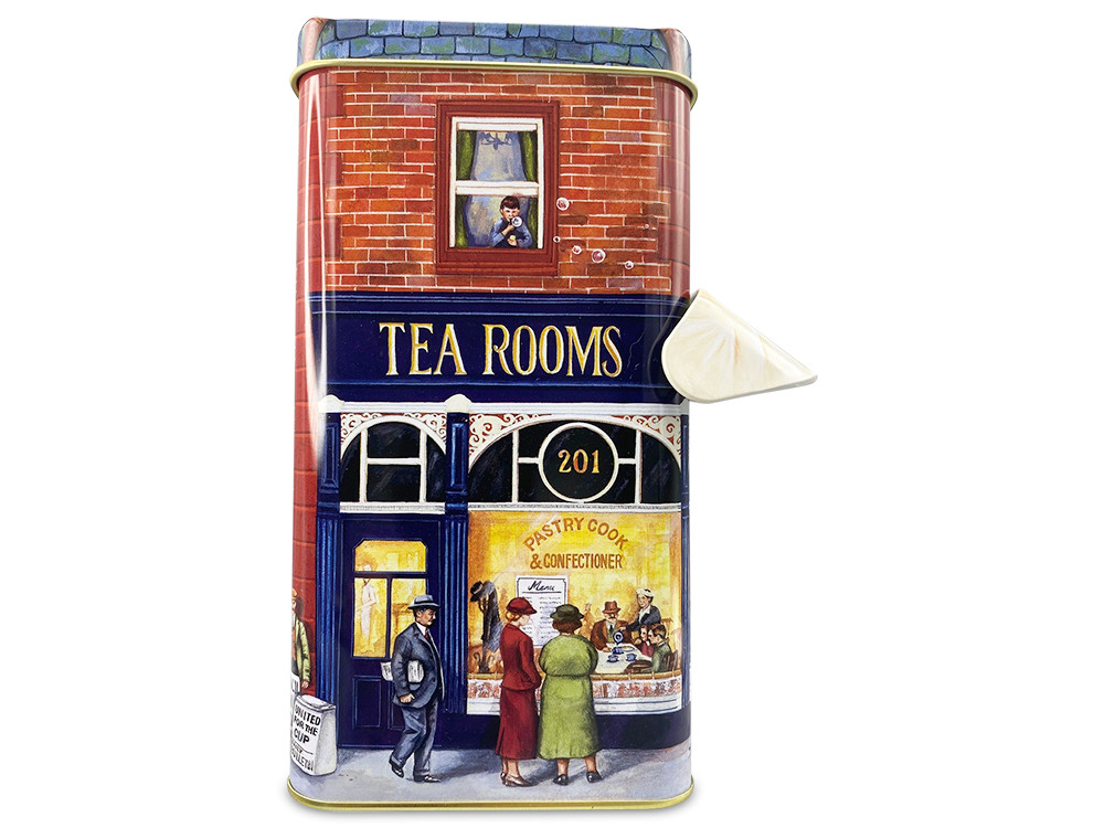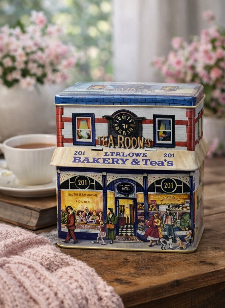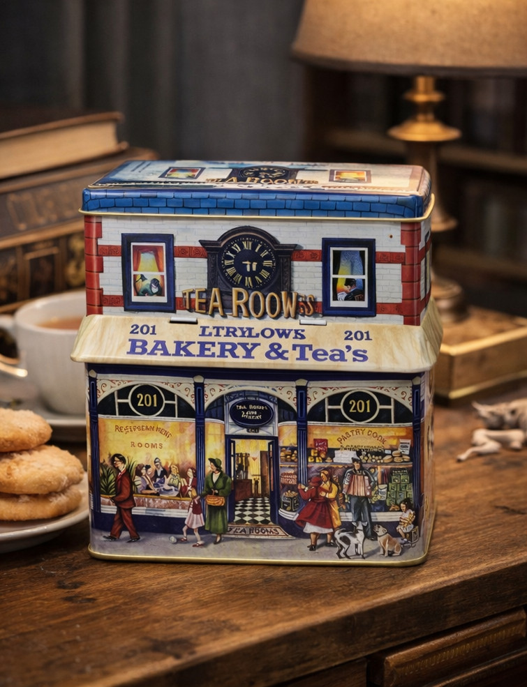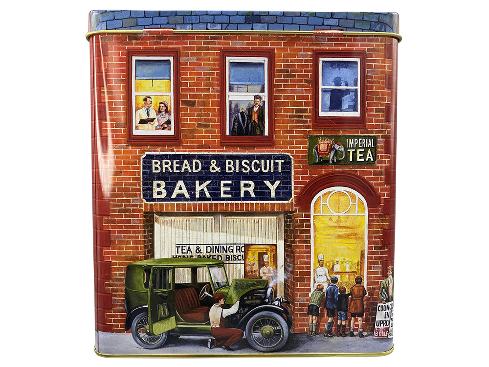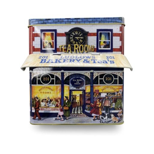 Gondosan megmunkált, házikó alakú fém doboz régi pékség és teázó mintával, felnyitható napellenzővel. Egyedi formája teszi különlegessé, használható lakásdekorként, de a házikó tetejét kinyitva mindenféle finomságot is belepakolhatunk. A termék élelmiszerbiztos, így az édesség közvetlenül is belekerülhet.