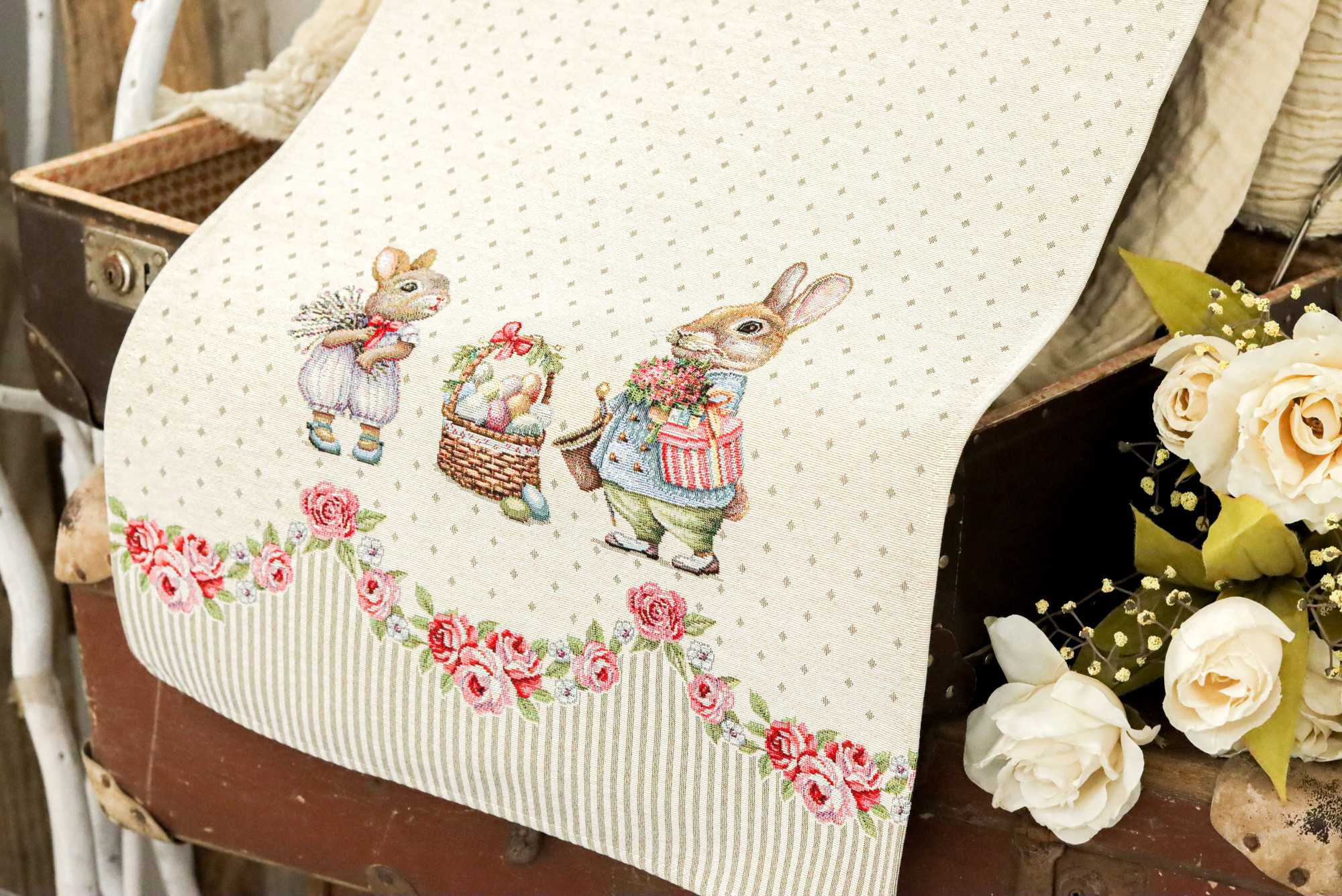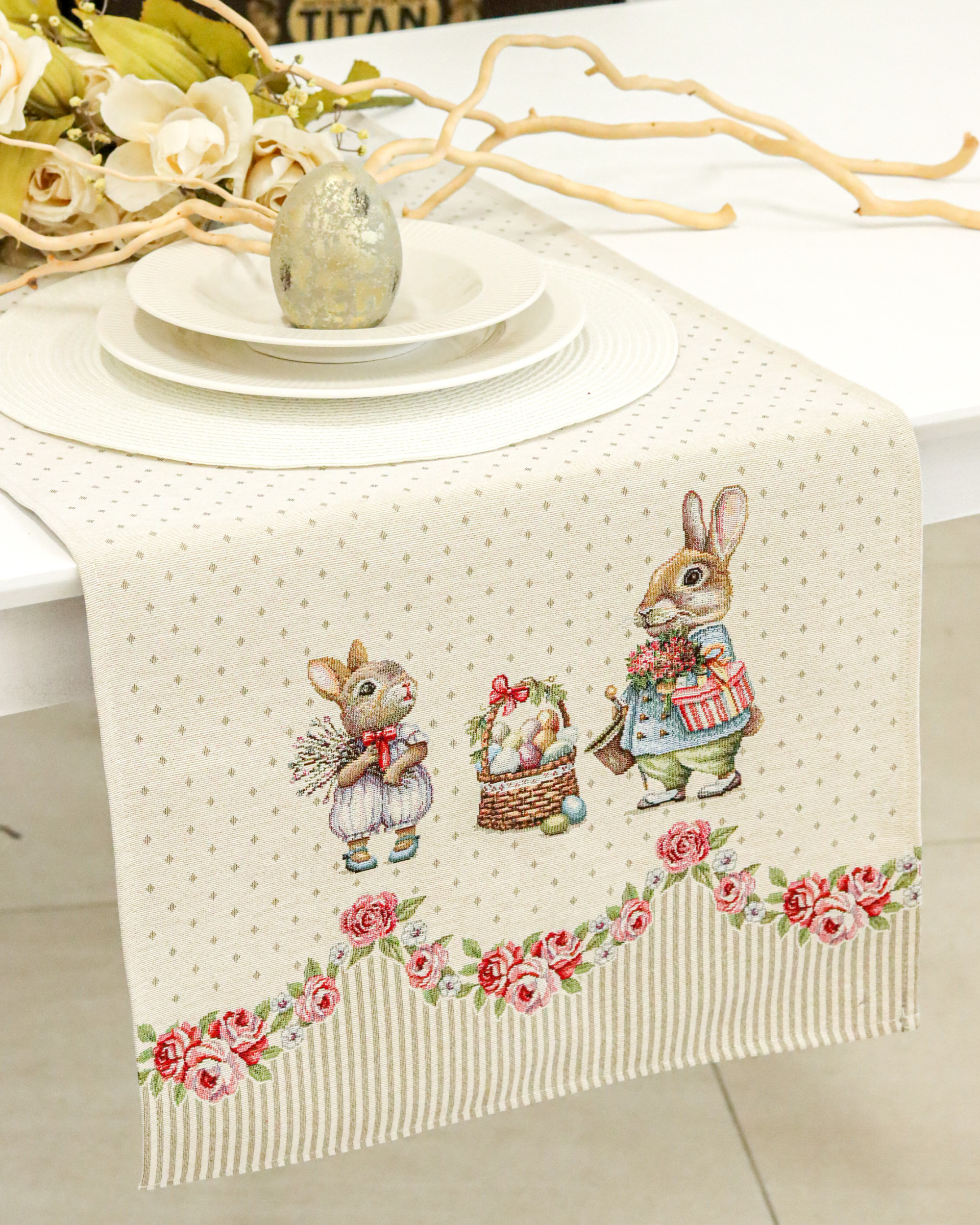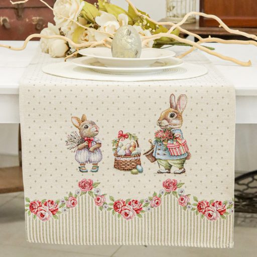 Húsvéti nyuszis, rózsás gépi gobelin kis futó, amely pompásan mutat a húsvéti ünnepekkor az étkezőben vagy a dohányzóasztalon. Minden tekintetet az asztalra vonz, hosszú éveken át megőrzi színét és minőségét megfelelő kezelés mellett.