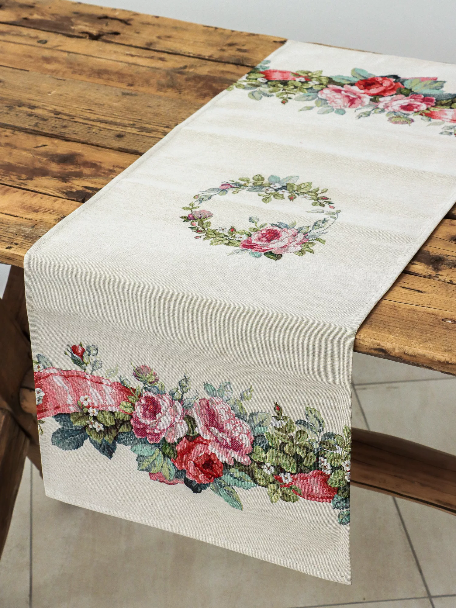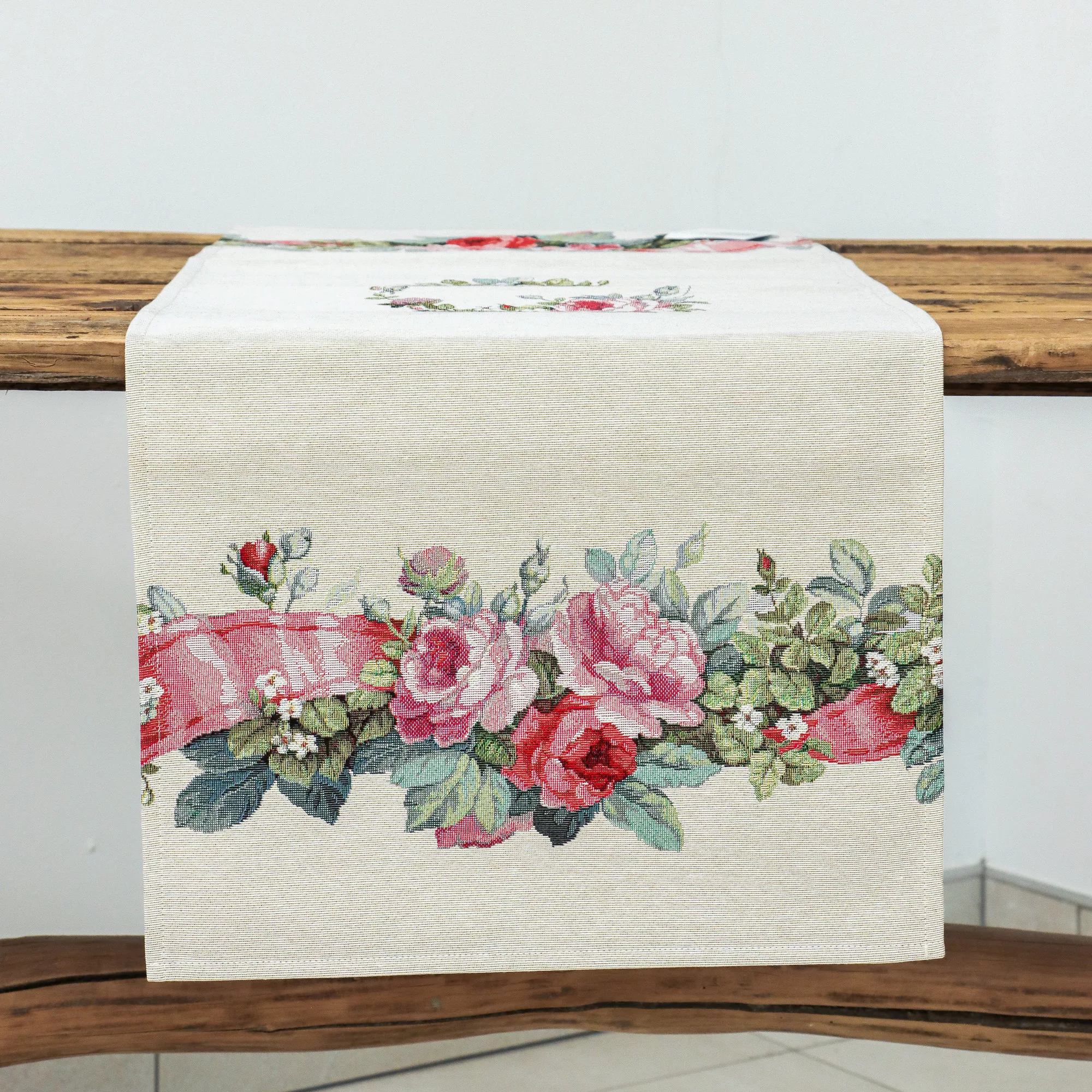 Varázsold az étkezőasztalt egy romantikus, virágos kertté a „Rózsakert” spanyol gépi gobelin asztali futóval! A prémium minőségű futó gazdag rózsa- és levélmotívumokkal, valamint játékos rózsaszín szalagdíszítéssel keretezi az asztalt. A középen elhelyezett apró virágkoszorú finom, elegáns részlet, amely különleges hangulatot ad bármilyen terítésnek.