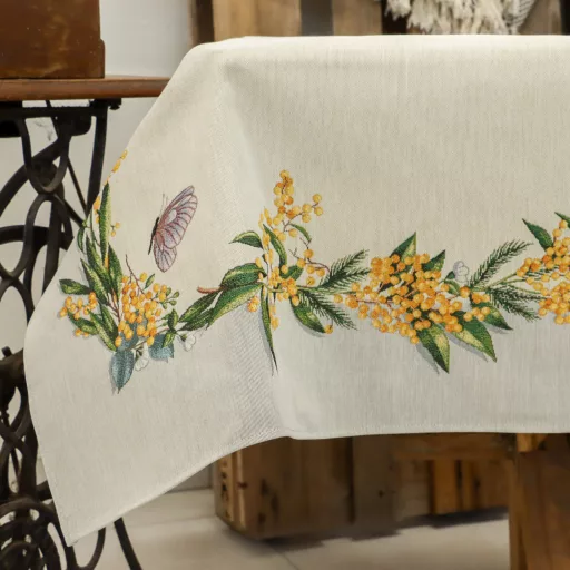 Gyönyörű sárga mimóza virágokkal díszített asztalterítő, melynek egyedülálló szépsége minden tekintetet az asztalra vonz. Lepd meg magad vagy szeretteidet egy prémium minőségű asztalterítővel!