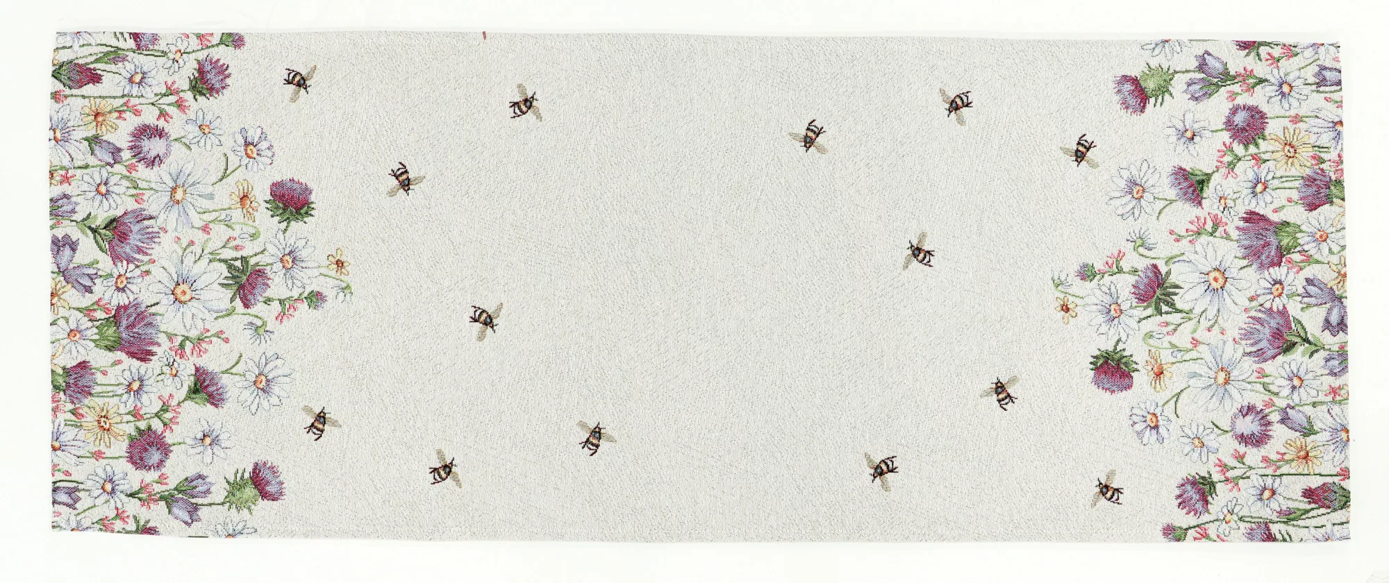 Töltsd meg otthonod a természet bájával ezzel a gépi szövésű gobelin asztali futóval! A virágzó rét hangulatát idéző, részletgazdag vadvirágok és játékosan röpködő méhecskék elevenítik meg a tavaszi mező érzését. Az élénk színek és a finoman texturált anyag egyaránt eleganciát és vidámságot visznek az étkezőasztalra.