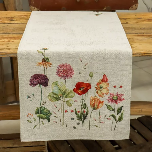 Gyönyörű virágokkal díszített asztali futó, világos szürke alappal. Lepd meg magad vagy szeretteidet egy prémium minőségű asztalterítővel!